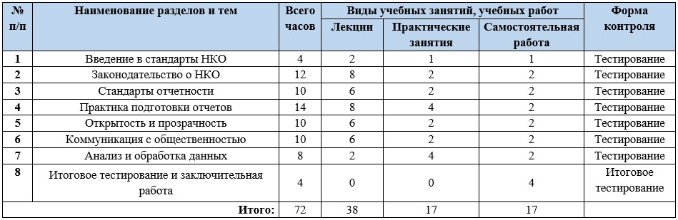Программа повышения квалификации разработана с учётом актуальных стандартов информационной прозрачности и требований законодательства, а также учитывает специфику работы НКО. Это позволит участникам программы овладеть необходимыми знаниями и навыками для грамотного построения систем внутренней и внешней отчётности, что значительно улучшит репутацию организации и её взаимодействие с общественностью.